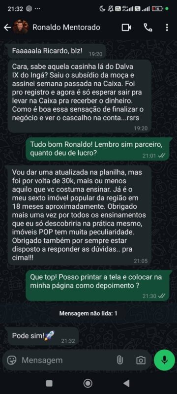 Outra possibilidade nos leilões da Caixa Econômica é usar o seu FGTS, nesse caso você precisaria ter o dinheiro dos impostos e registro, uma vez que utilizou o FGTS ára pagar o imóvel à vista ou parte dele. Pode ainda deixar uma parte do FGTS para ir pagando as parcelas. Lembrando ainda que muitos começam cotizando, não somente para dividir o valor, mas também para ter alguém com quem contar durante as fases do processo. Lembramos que você não estará sozinho. Eu e minha equipe estaremos no grupo de whatsapp com você para te auxiliar em suas dúvidas.